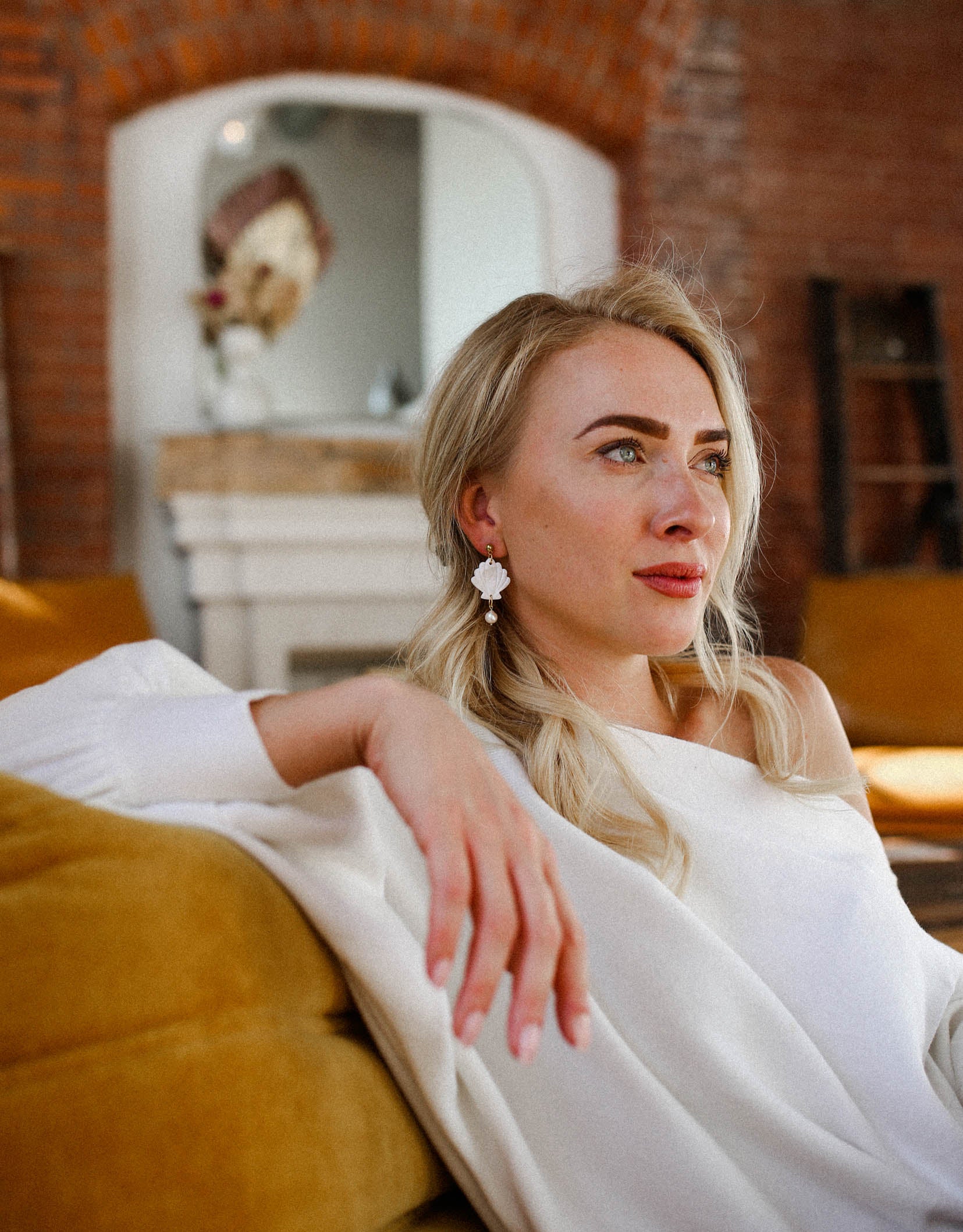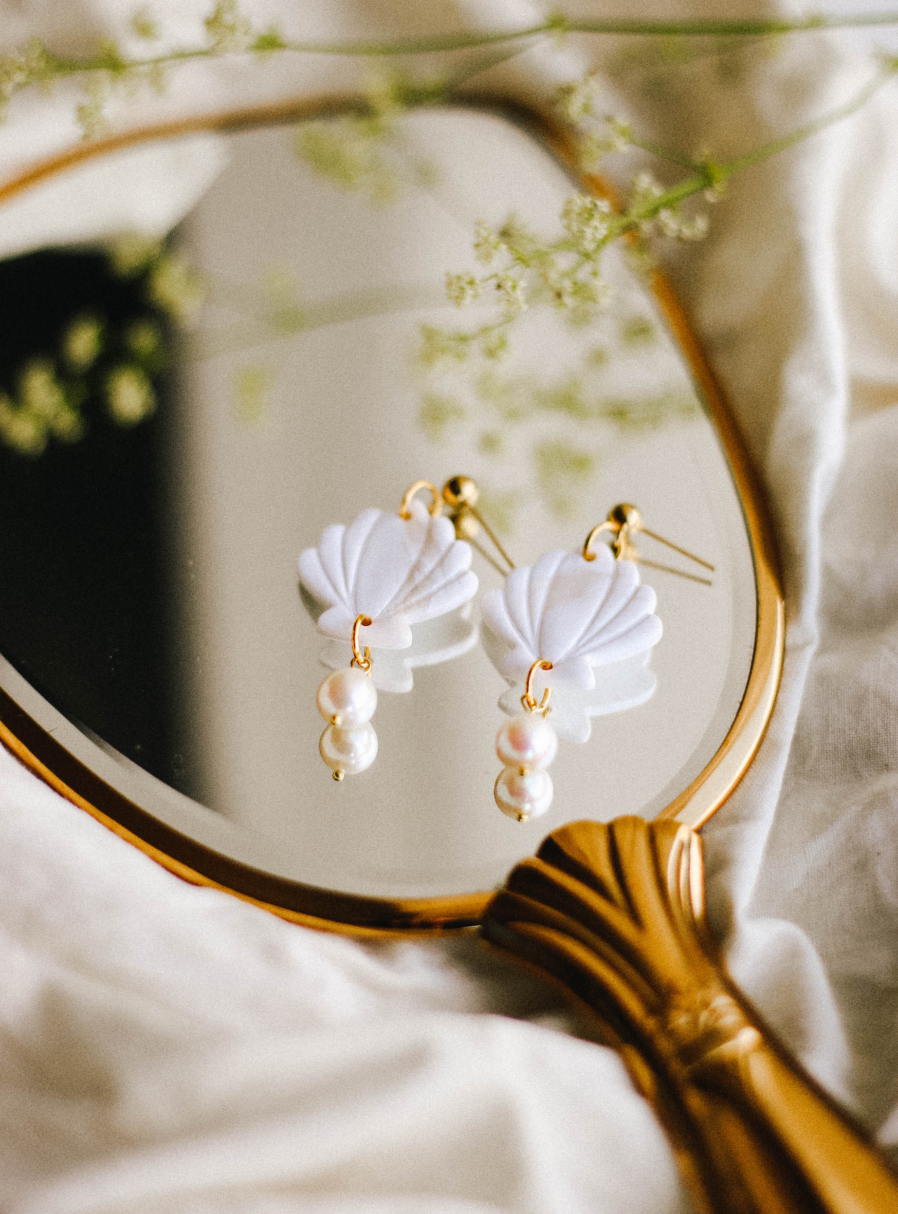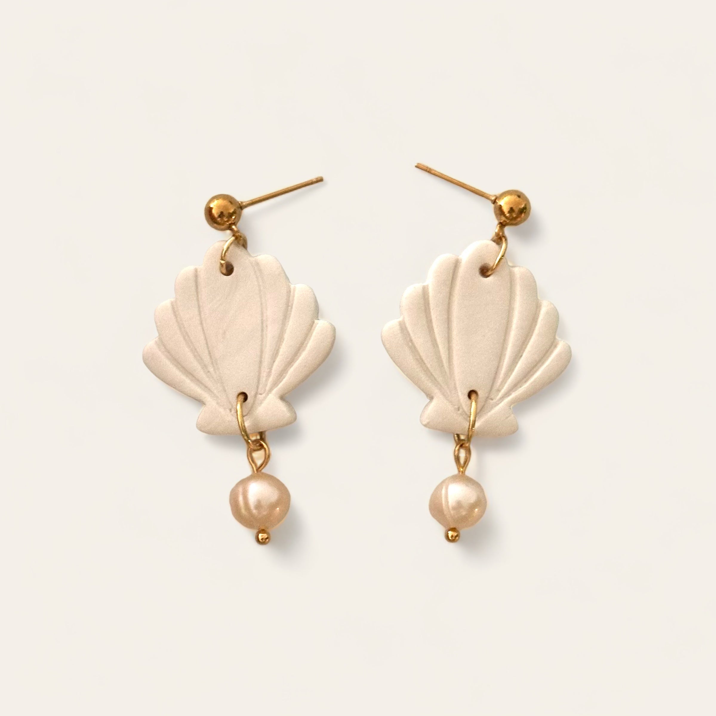 pearl and polymer clay seashell earrings. these earrings are slightly shiny and slightly marbled. please note, as these are handmade and use natural freshwater pearls, every pair is one of a kind and will look a little bit different!