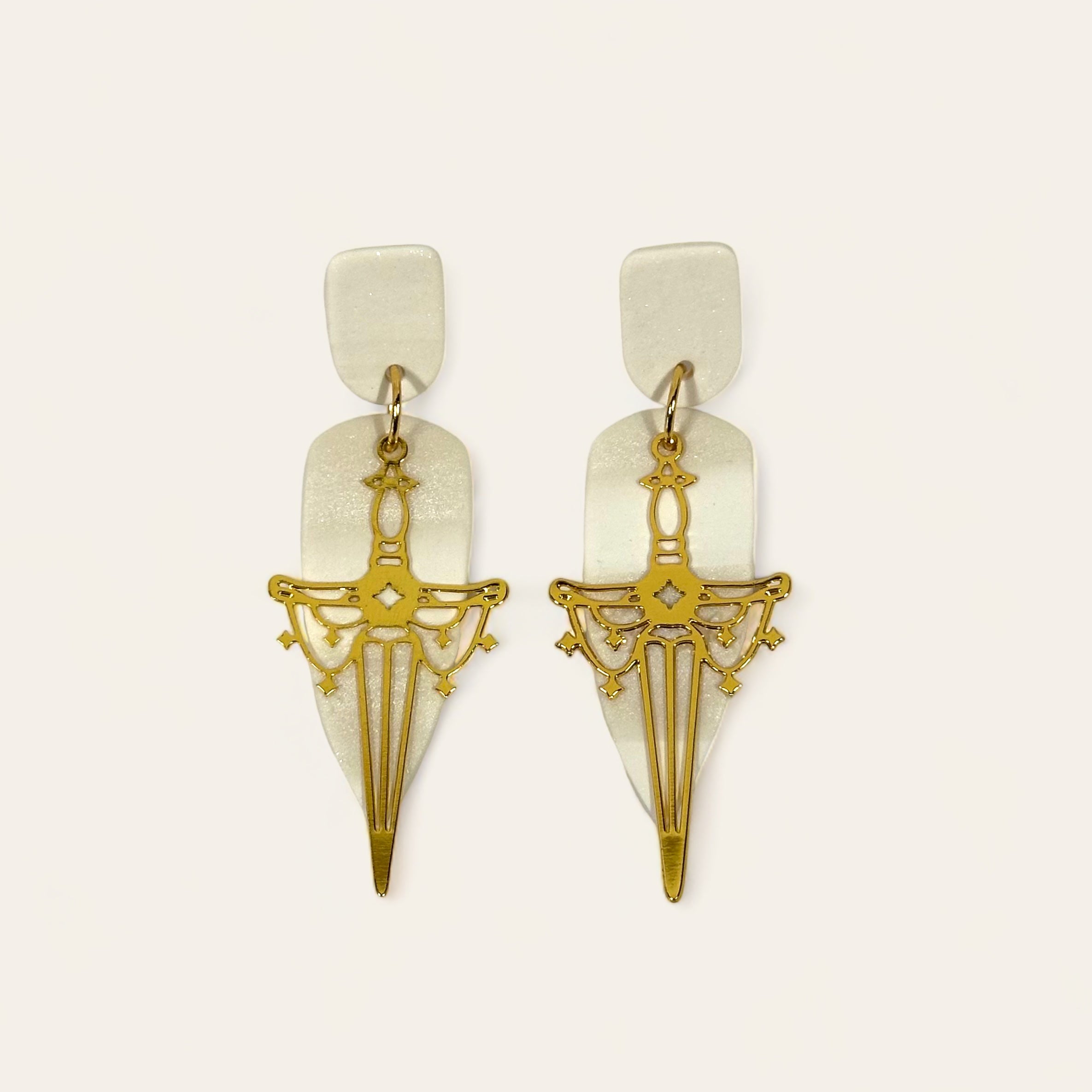 clay dagger earrings with a slight sheen and marble. please note these are handmade earrings and every pair may look slightly different.