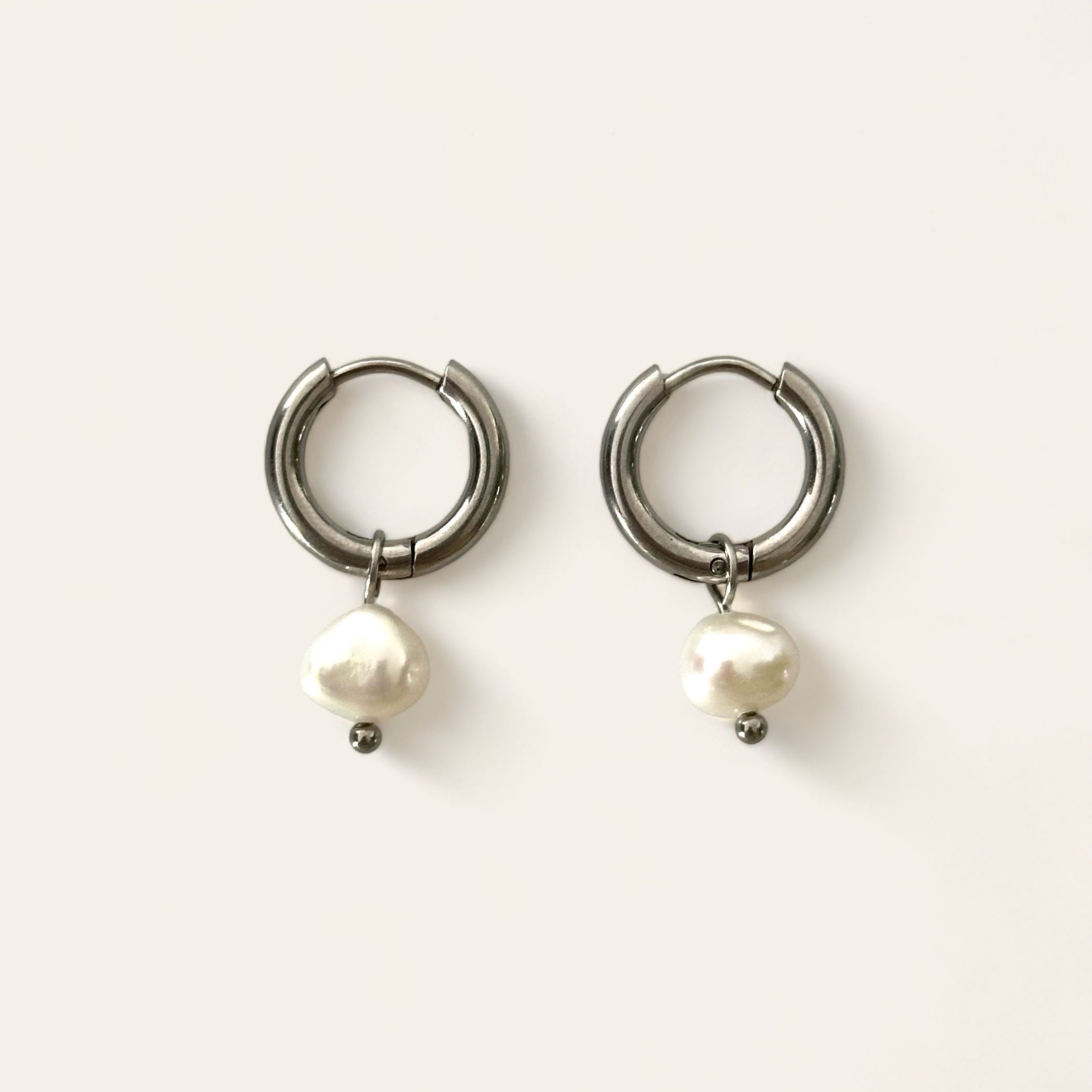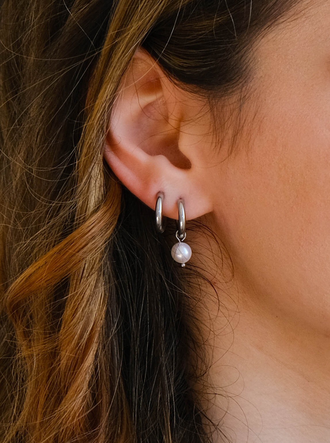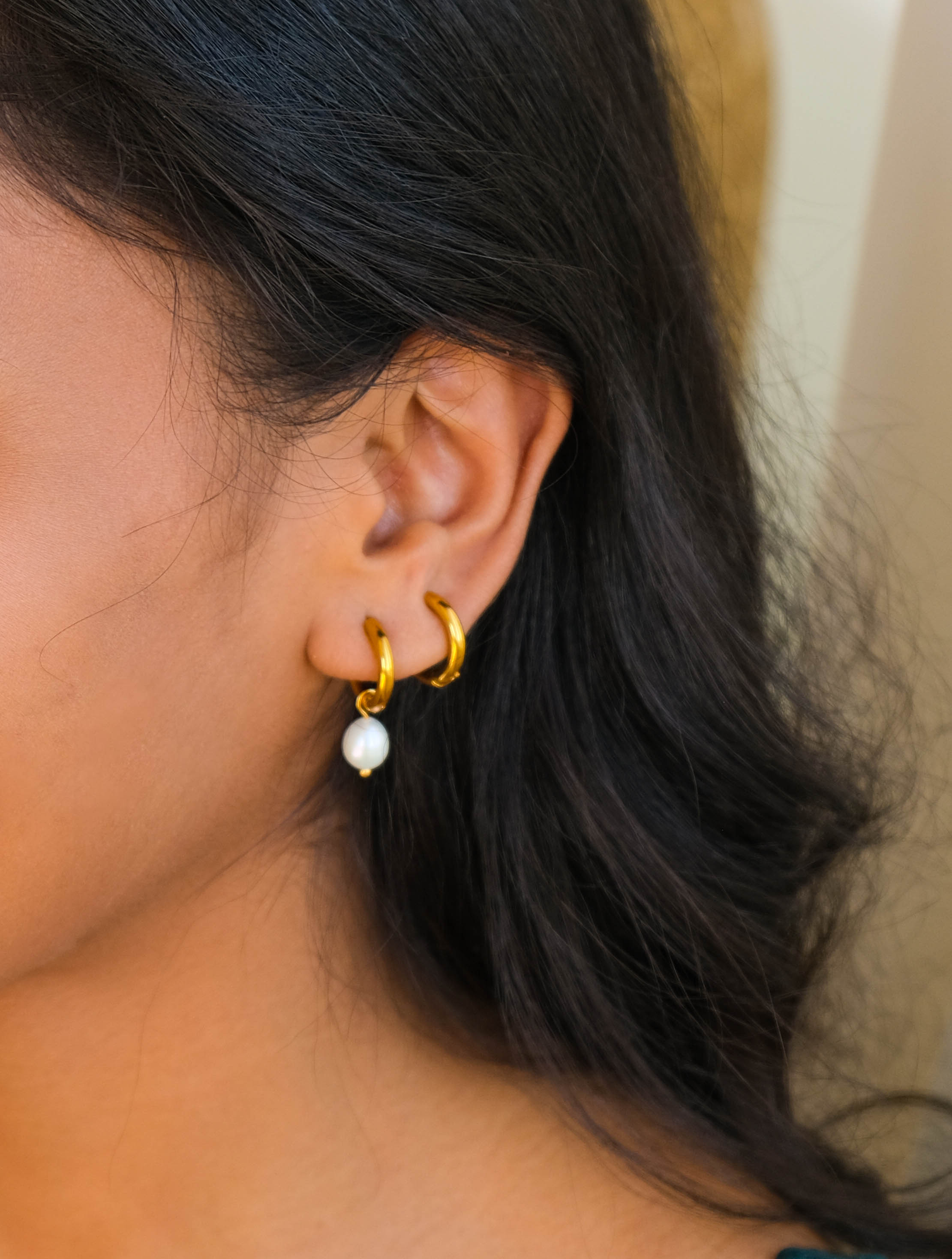our fav thing about these adorable huggie hoops? versatility! wear them as pearl hoops or slide the pearls off for simple every-day hoops. please note, as these are natural freshwater pearls, the size, shape and colour will vary between earrings.