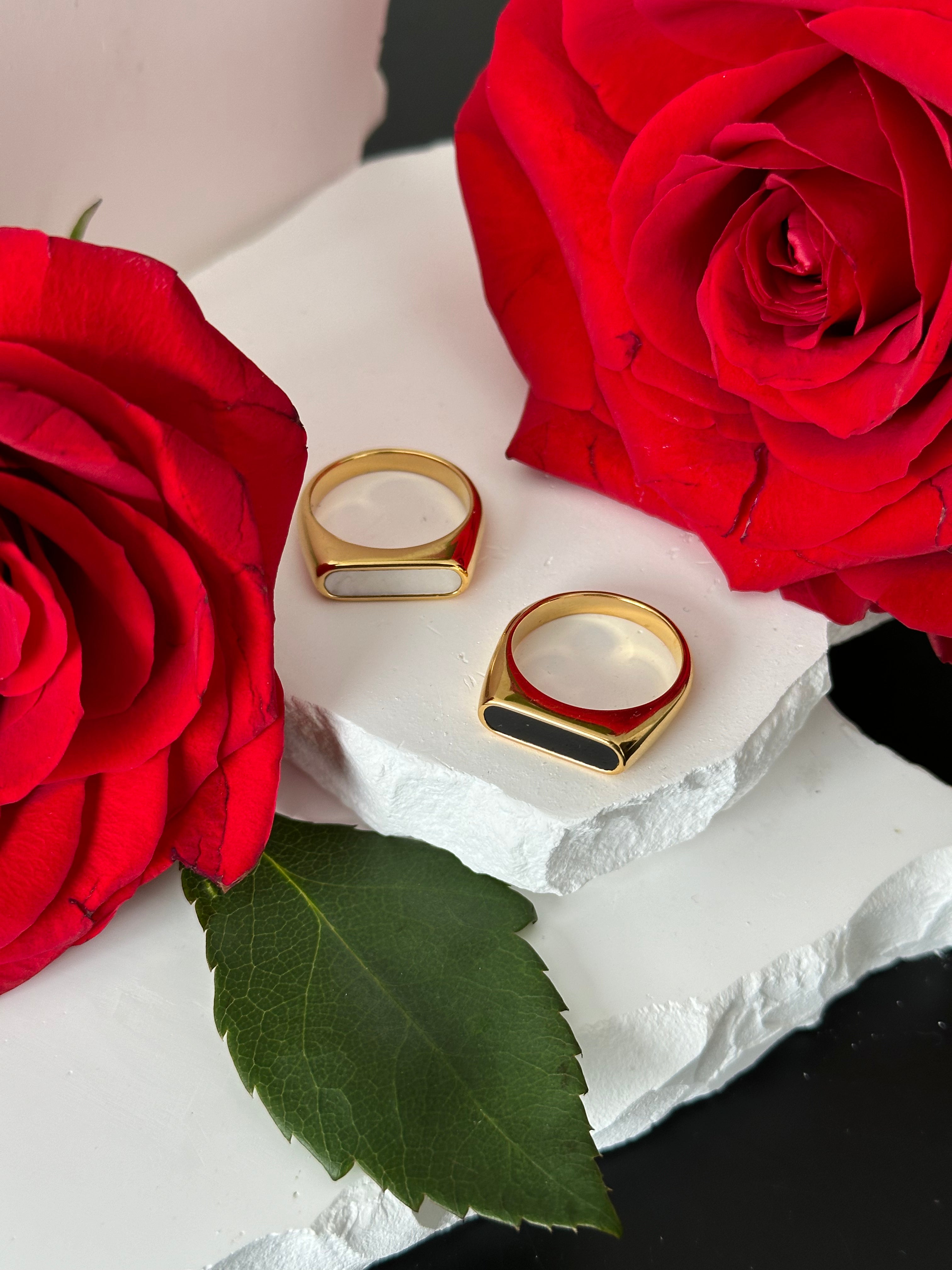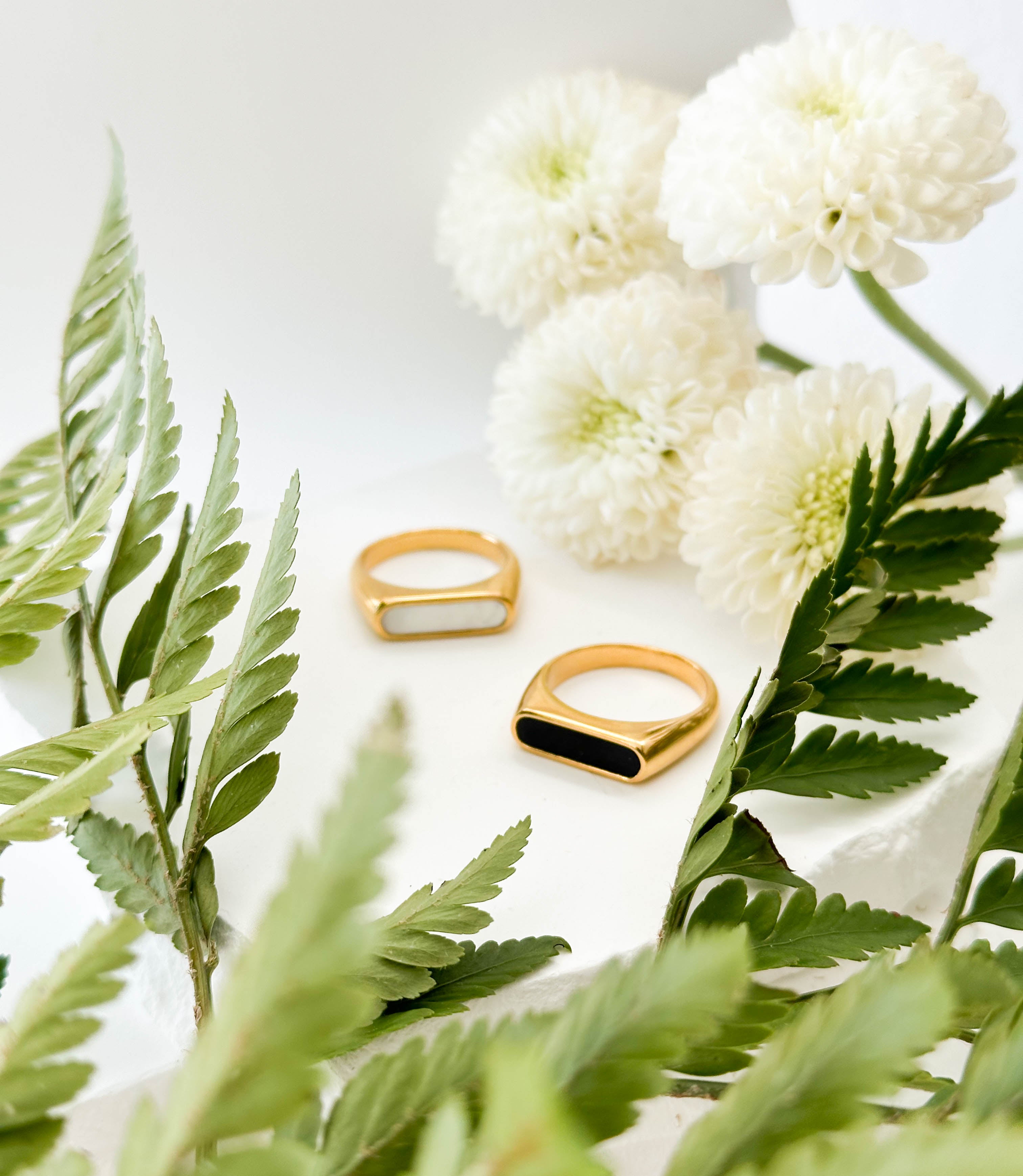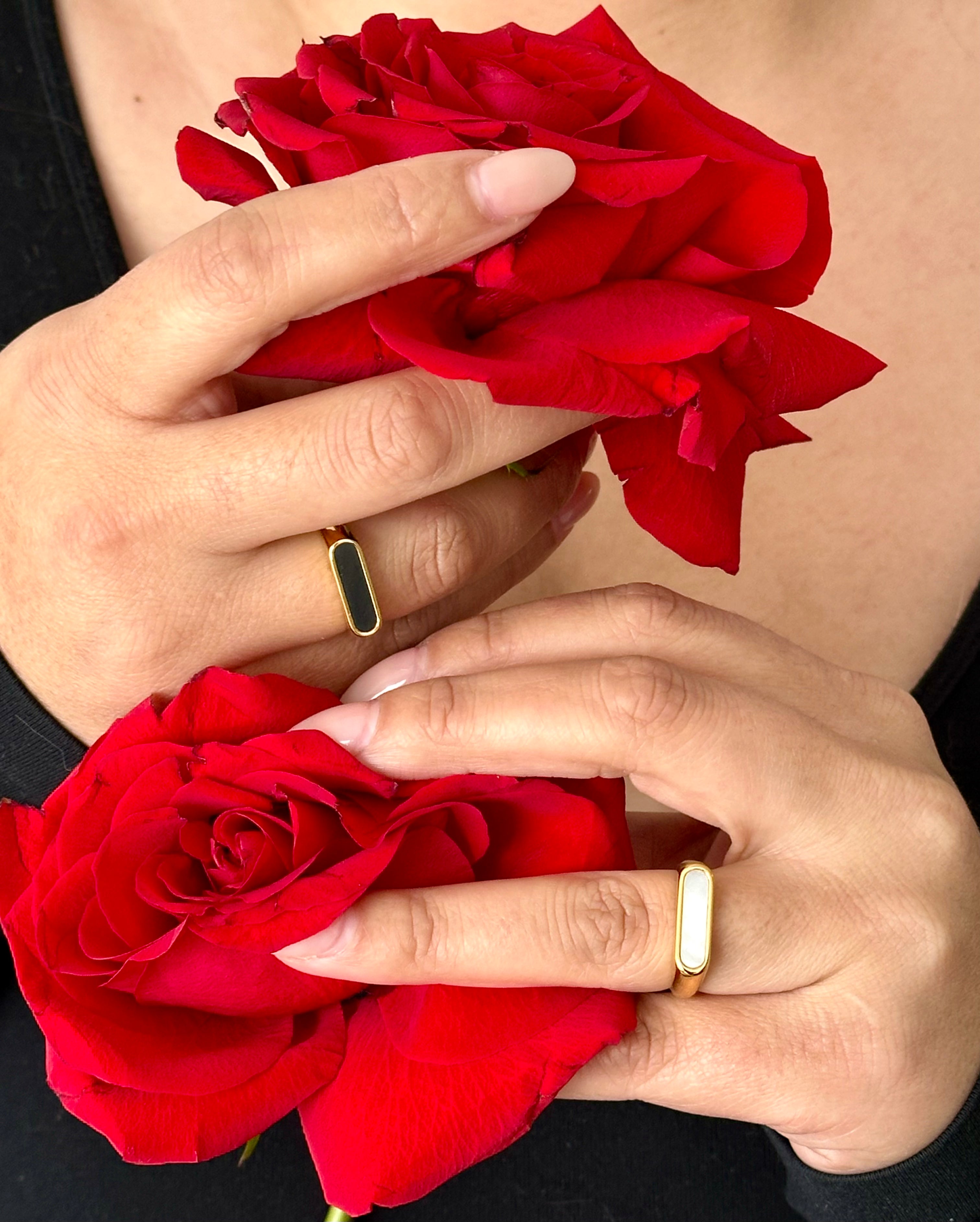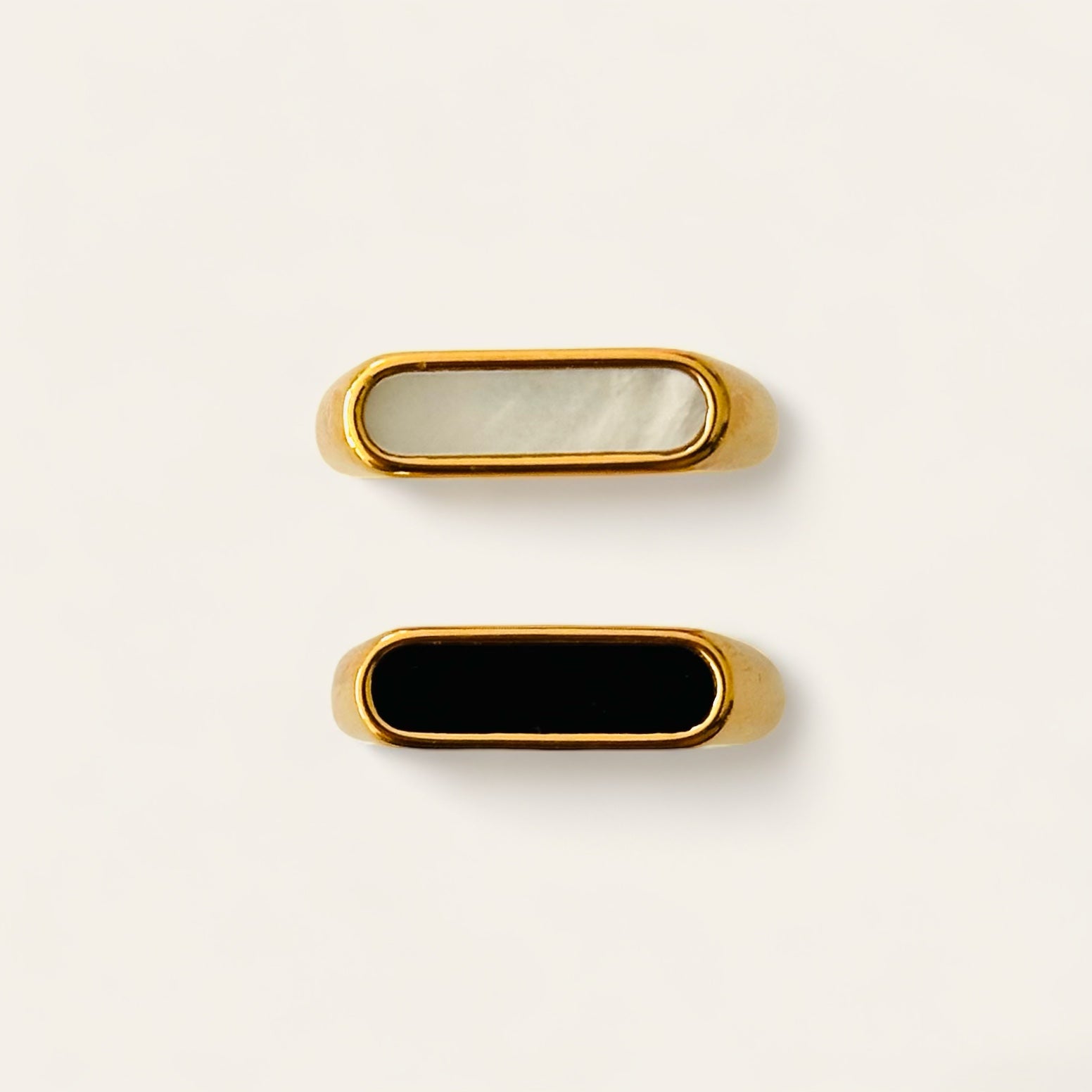 edgy black or mother-of-pearl enamel bar rings in 18k gold-plated surgical-grade stainless steel.